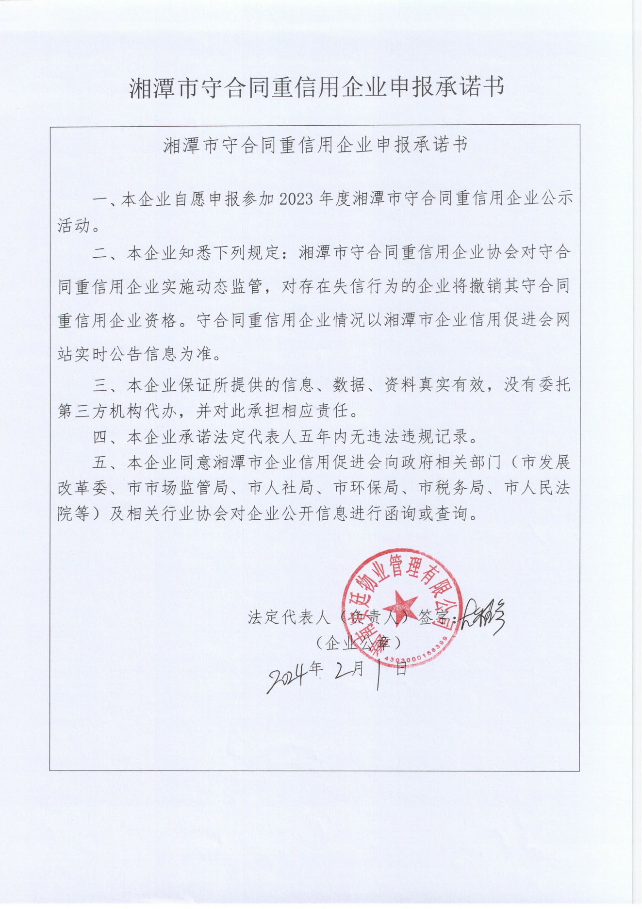 本企業(yè)根據《湘潭市守合同重信用企業(yè)申報規(guī)定》等編制 2023 年度企業(yè)信用報告書,并保證本報告書內容真實、準確、完整。