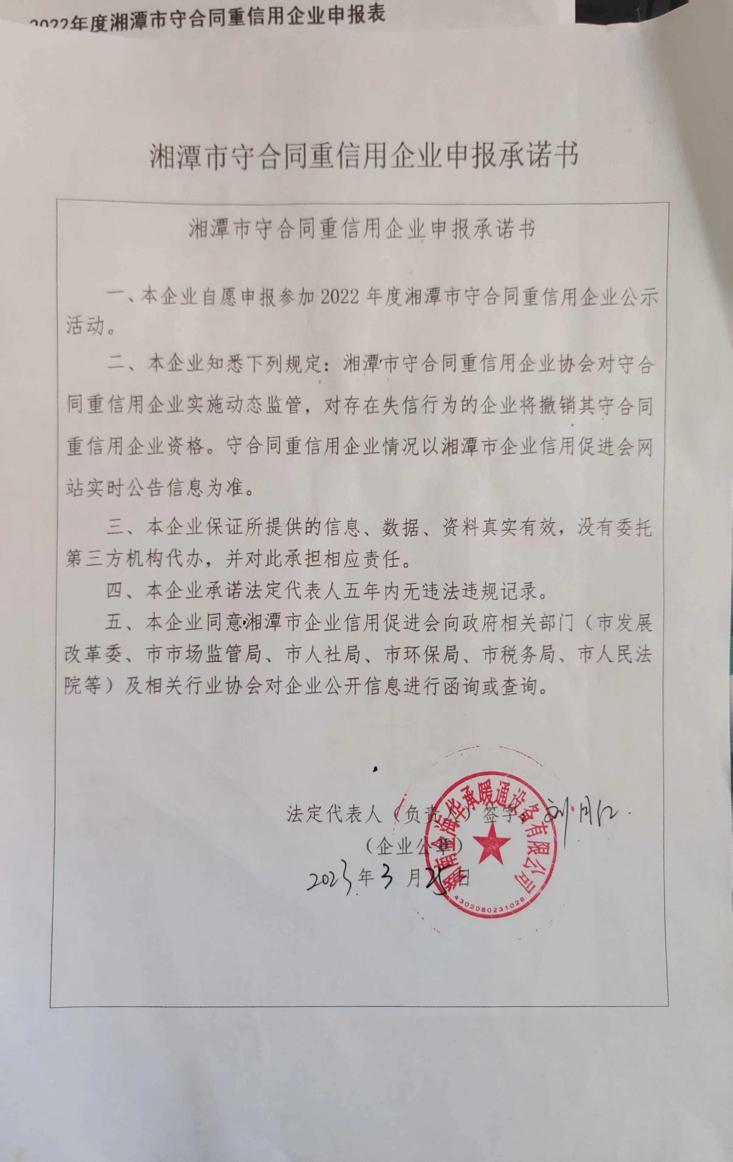 本企業(yè)根據(jù)《湘潭市守合同重信用企業(yè)申報規(guī)定》等編制 2022 年度企業(yè)信用報告書,并保證本報告書內(nèi)容真實、準(zhǔn)確、完整。