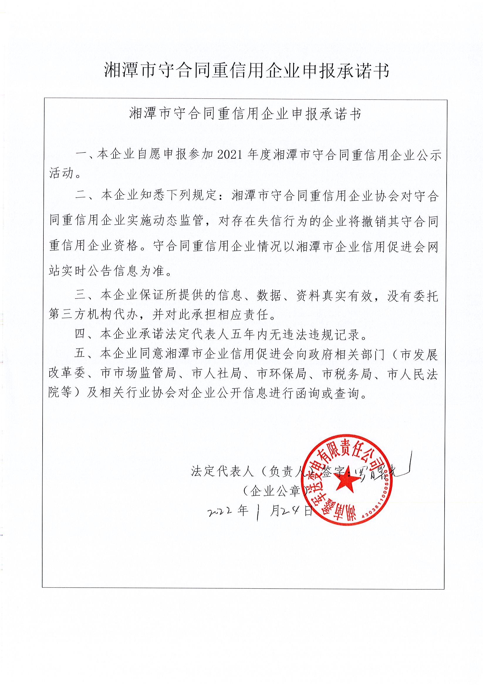 本企業(yè)根據(jù)《湘潭市守合同重信用企業(yè)申報規(guī)定》等編制 2021 年度企業(yè)信用報告書,并保證本報告書內(nèi)容真實(shí)、準(zhǔn)確、完整。
