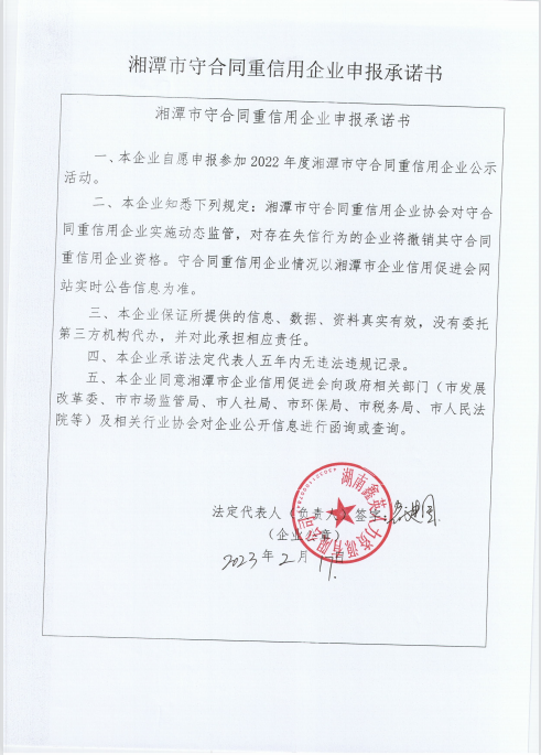 本企業(yè)根據(jù)《湘潭市守合同重信用企業(yè)申報規(guī)定》等編制 2022 年度企業(yè)信用報告書,并保證本報告書內(nèi)容真實(shí)、準(zhǔn)確、完整。