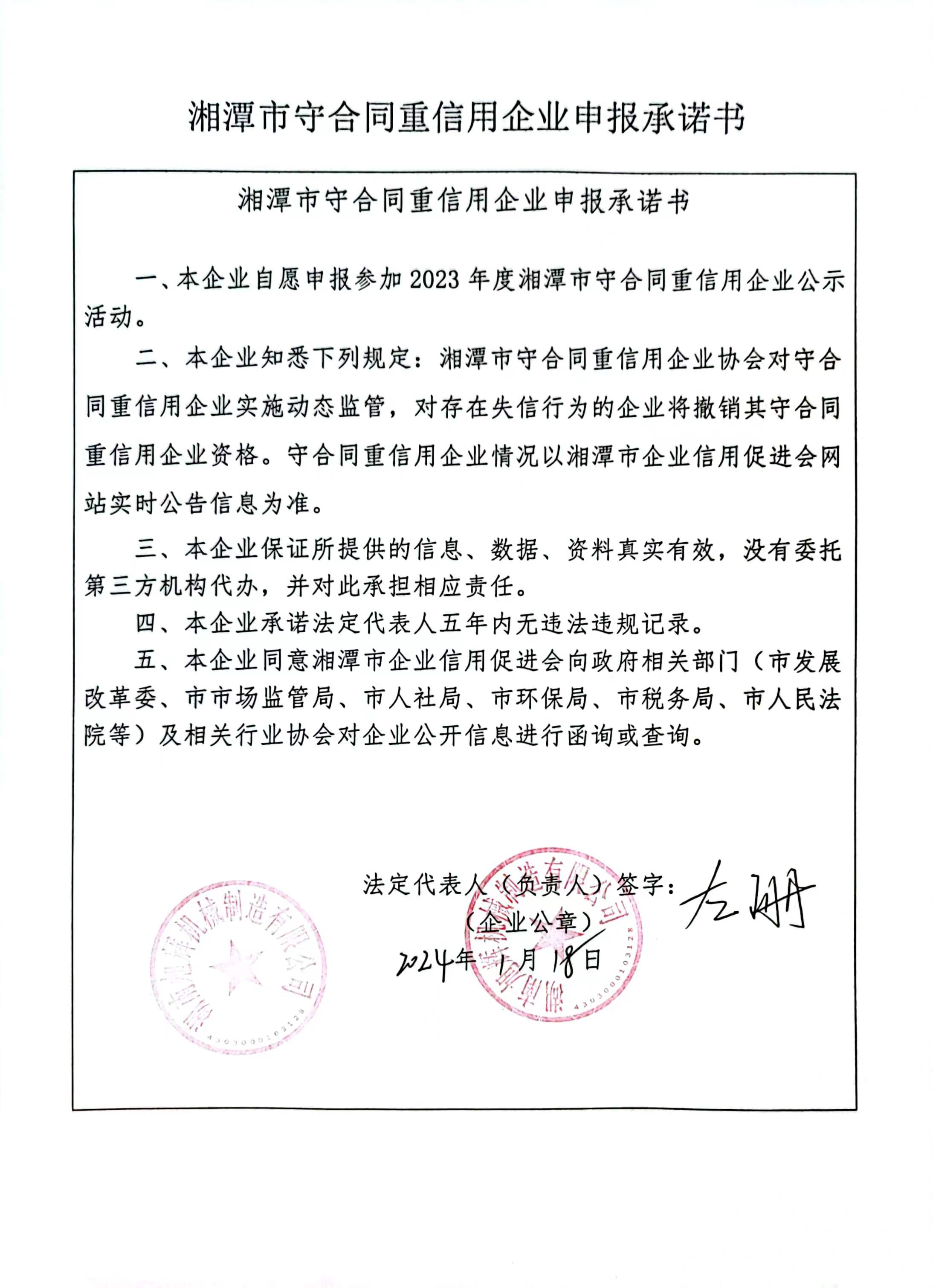 本企業(yè)根據(jù)《湘潭市守合同重信用企業(yè)申報規(guī)定》等編制 2023 年度企業(yè)信用報告書,并保證本報告書內(nèi)容真實(shí)、準(zhǔn)確、完整。