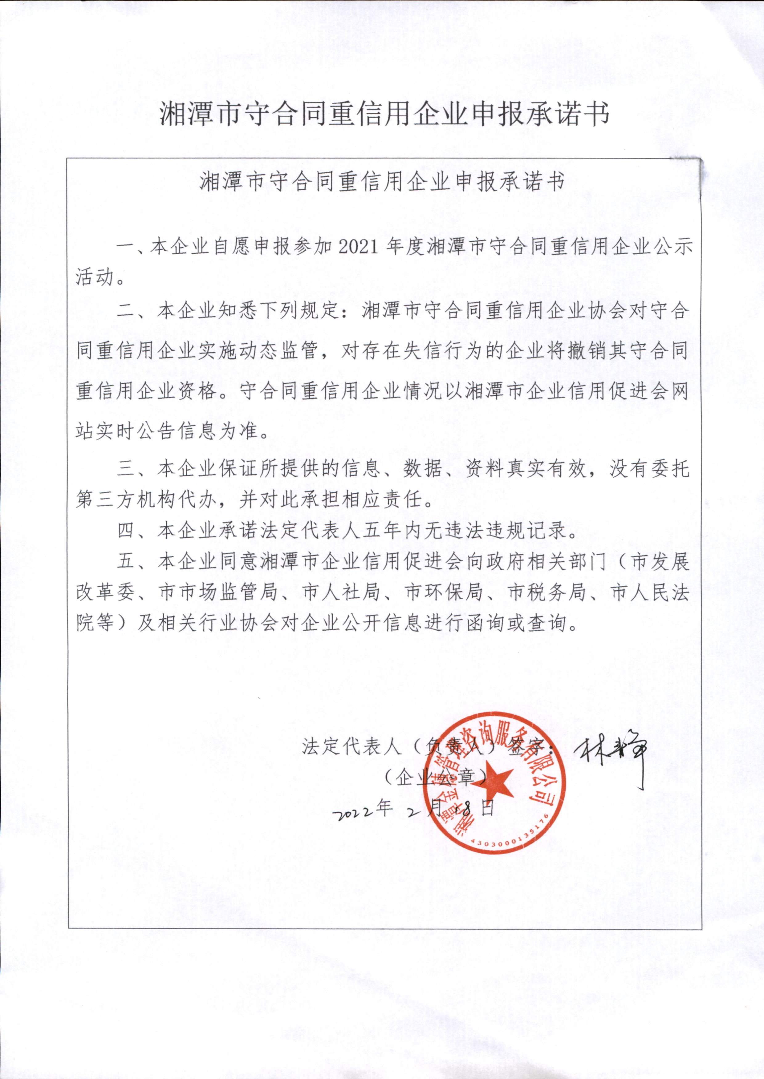 本企業(yè)根據(jù)《湘潭市守合同重信用企業(yè)申報規(guī)定》等編制 2021 年度企業(yè)信用報告書,并保證本報告書內(nèi)容真實、準確、完整。