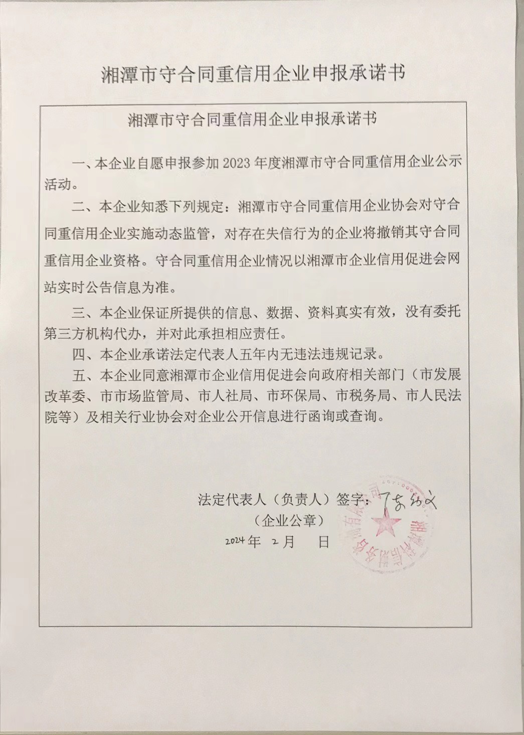 本企業(yè)根據(jù)《湘潭市守合同重信用企業(yè)申報規(guī)定》等編制 2023 年度企業(yè)信用報告書,并保證本報告書內(nèi)容真實、準確、完整。