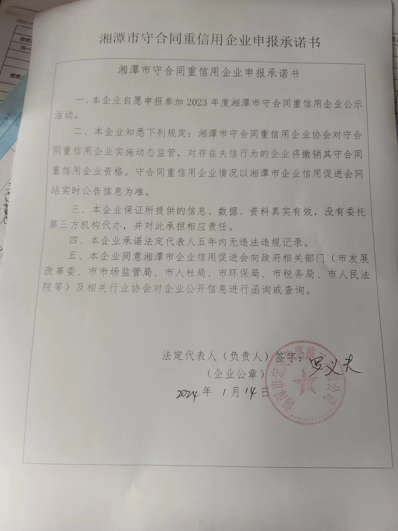 本企業(yè)根據(jù)《湘潭市守合同重信用企業(yè)申報規(guī)定》等編制 2023 年度企業(yè)信用報告書,并保證本報告書內(nèi)容真實、準確、完整。