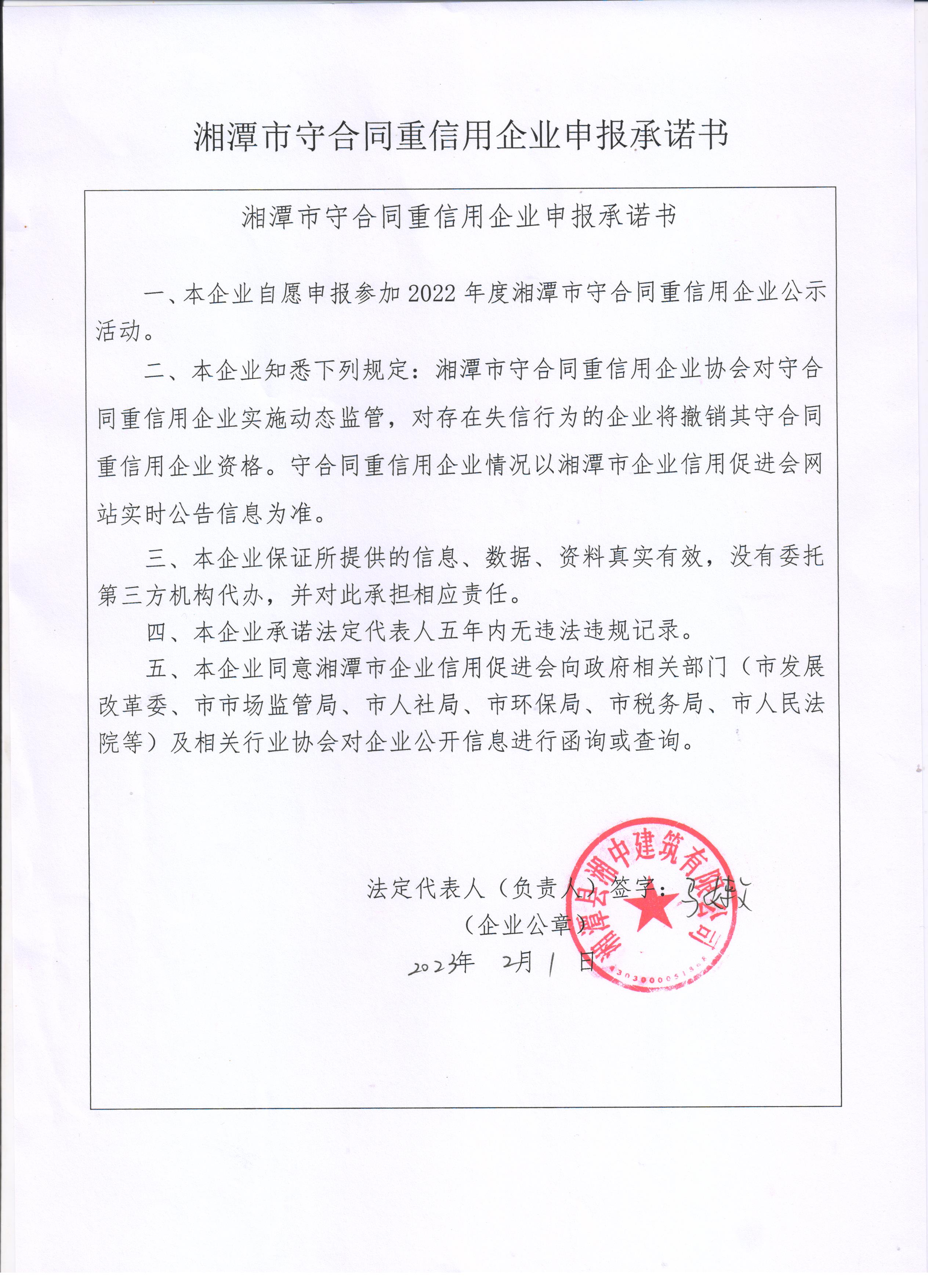 本企業(yè)根據(jù)《湘潭市守合同重信用企業(yè)申報規(guī)定》等編制 2022 年度企業(yè)信用報告書,并保證本報告書內(nèi)容真實(shí)、準(zhǔn)確、完整。